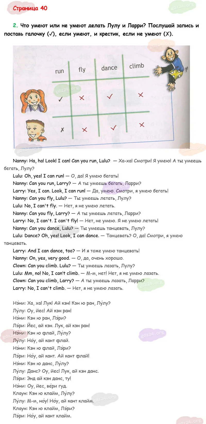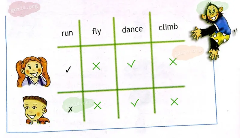 Что умеют или не умеют делать Лулу и Ларри? Послушай запись и поставь галочку (✓), если умеют, и крестик, если не умеют (✗).