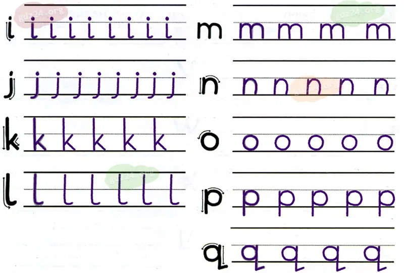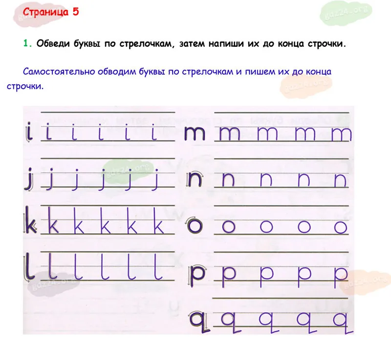 Обведи буквы по стрелочкам, затем напиши их до конца строчки.