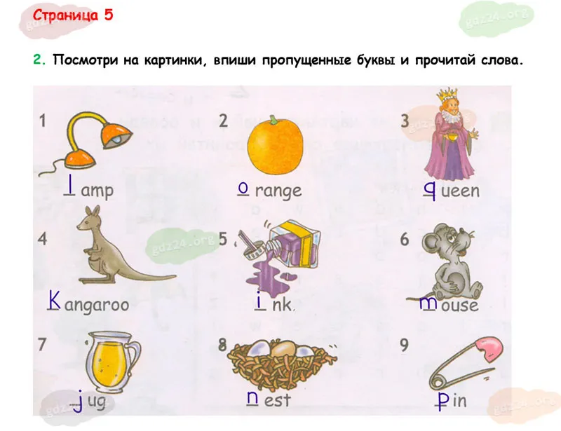 Посмотри на картинки, впиши пропущенные буквы и прочитай слова.