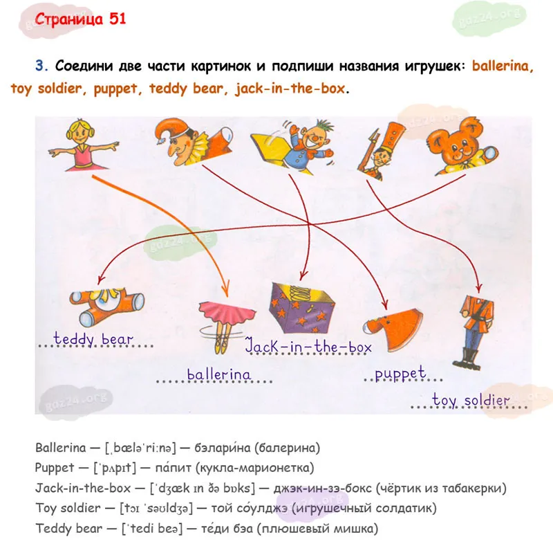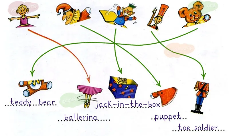 Соедини две части картинок и подпиши названия игрушек: ballerina, toy soldier, puppet, teddy bear, jack-in-the-box.