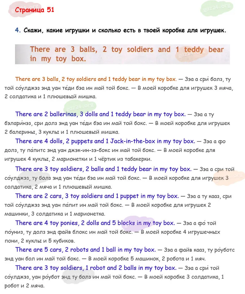 Скажи, какие игрушки и сколько есть в твоей коробке для игрушек.