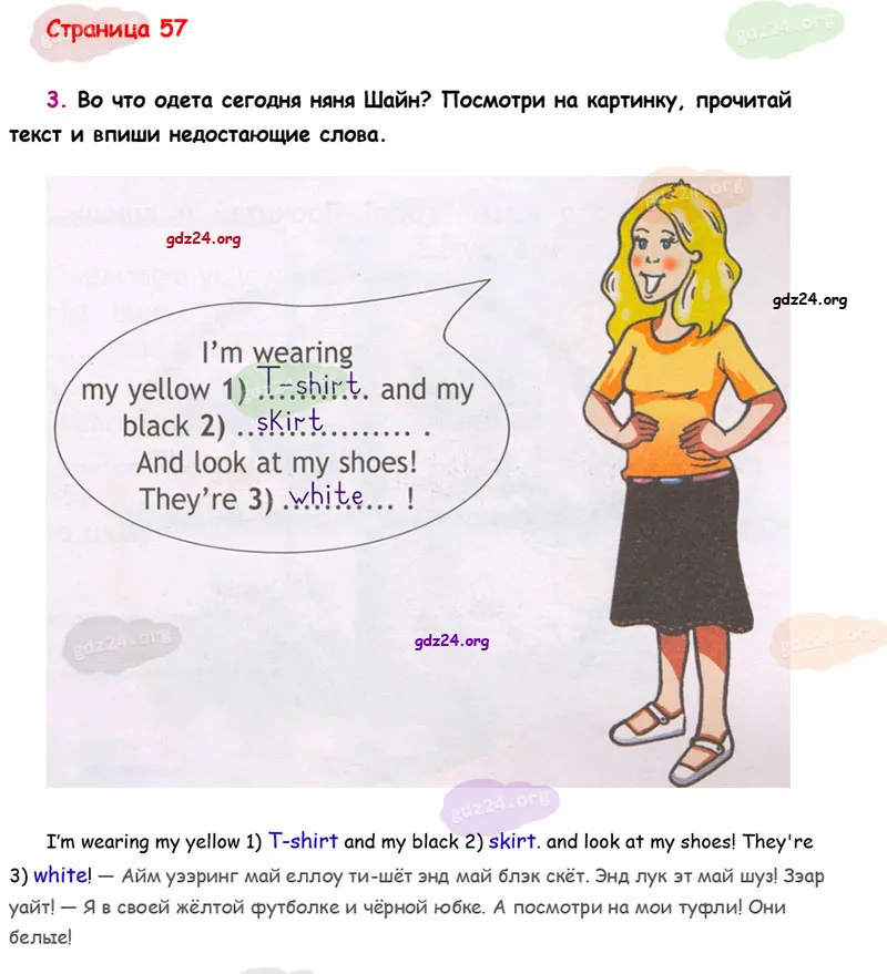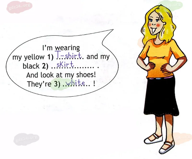 Во что одета сегодня няня Шайн? Посмотри на картинку, прочитай текст и впиши недостающие слова.