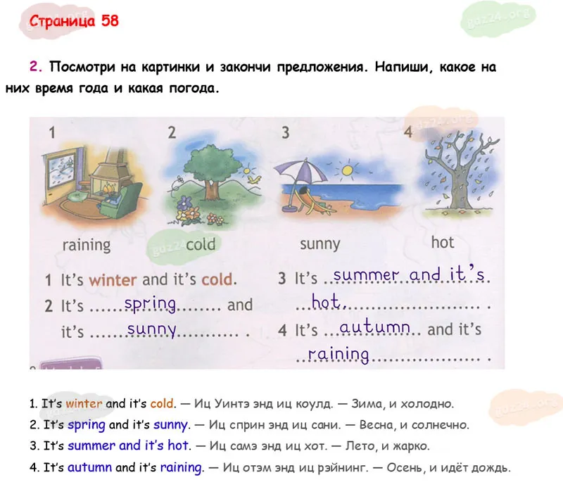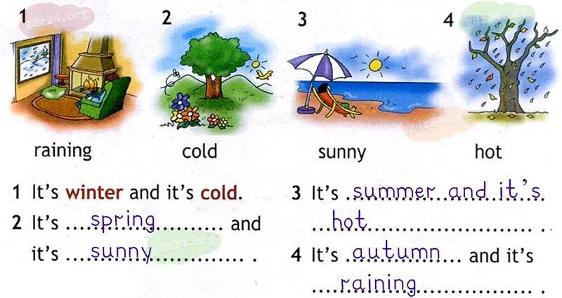 Посмотри на картинки и закончи предложения. Напиши, какое на них время года и какая погода.