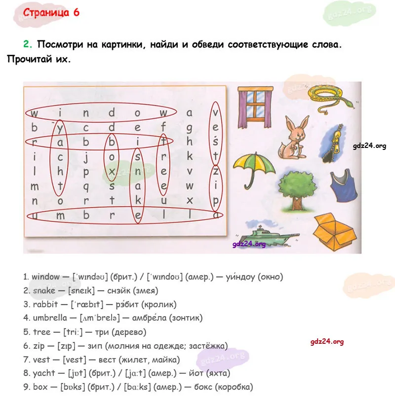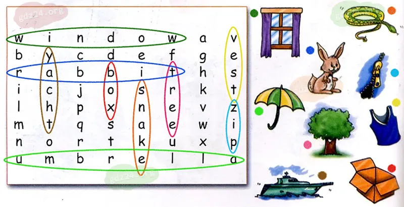 Посмотри на картинки, найди и обведи соответствующие слова. Прочитай их.
