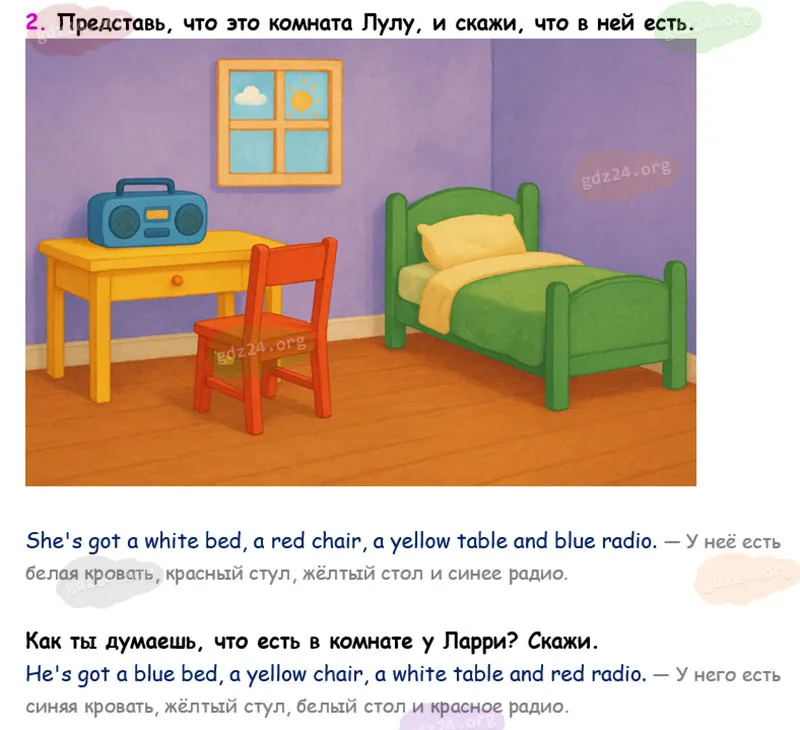 Представь, что это комната Лулу, и скажи, что в ней есть.