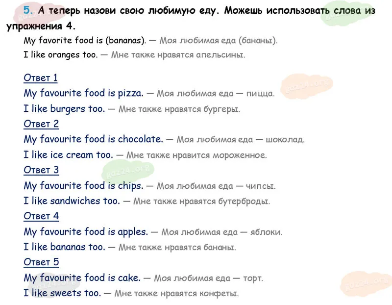 А теперь назови свою любимую еду. Можешь использовать слова из упражнения 4.