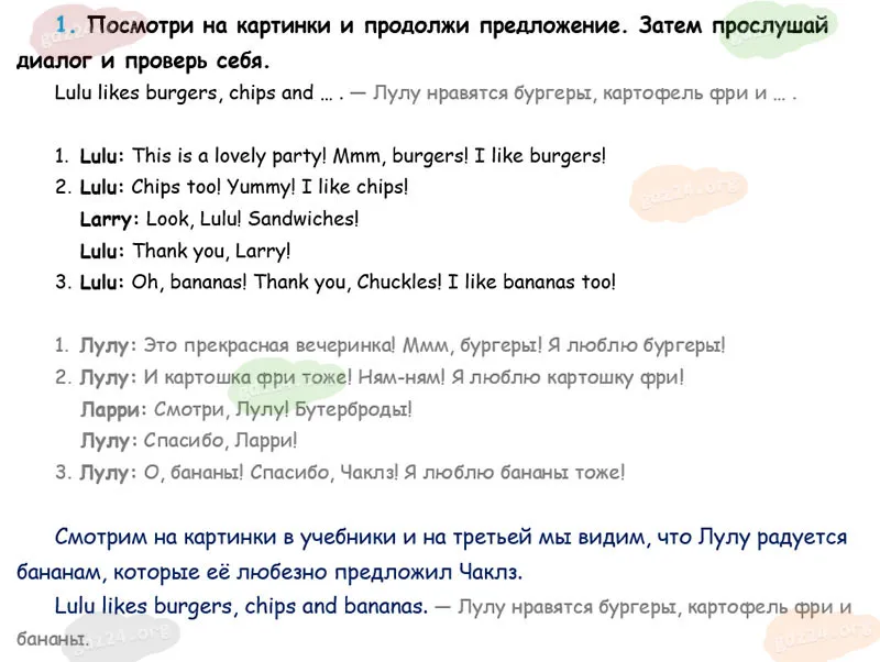 Посмотри на картинки и продолжи предложение. Затем прослушай диалог и проверь себя.