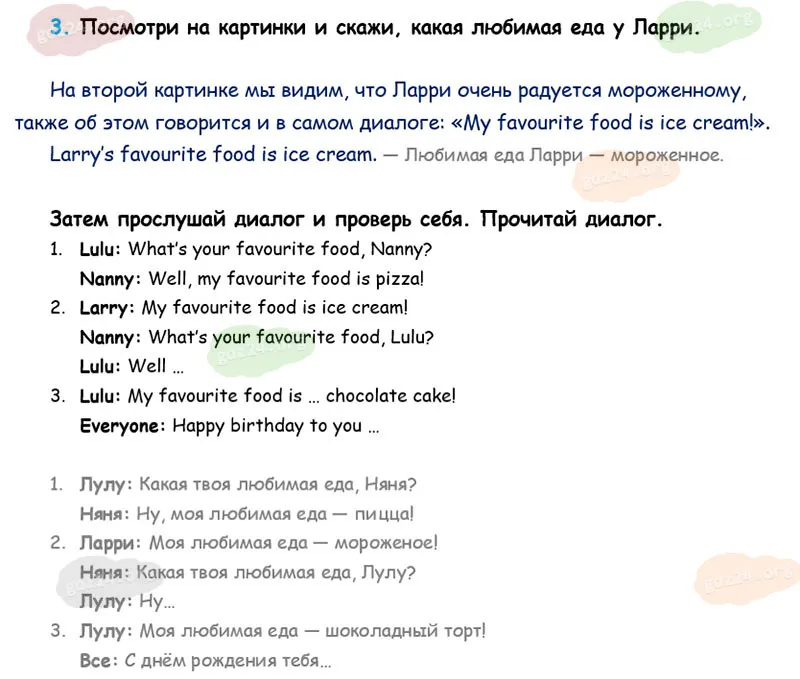 Посмотри на картинки и скажи, какая любимая еда у Ларри. Затем прослушай диалог и проверь себя. Прочитай диалог.