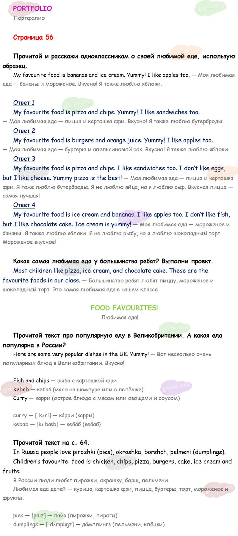 Прочитай текст про популярную еду в Великобритании. А какая еда популярна в России? Прочитай текст на с. 64.