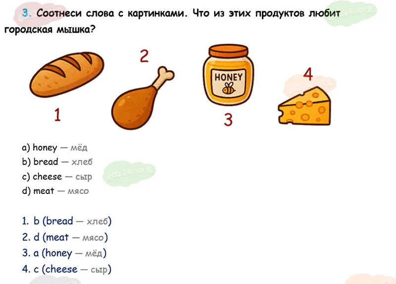 Соотнеси слова с картинками. Что из этих продуктов любит городская мышка?