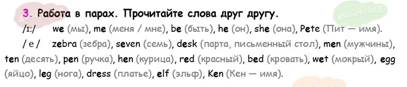/e/ zebra, seven, desk, men, ten, pen, hen, red, bed, wet, egg, leg, dress, elf, Ken.