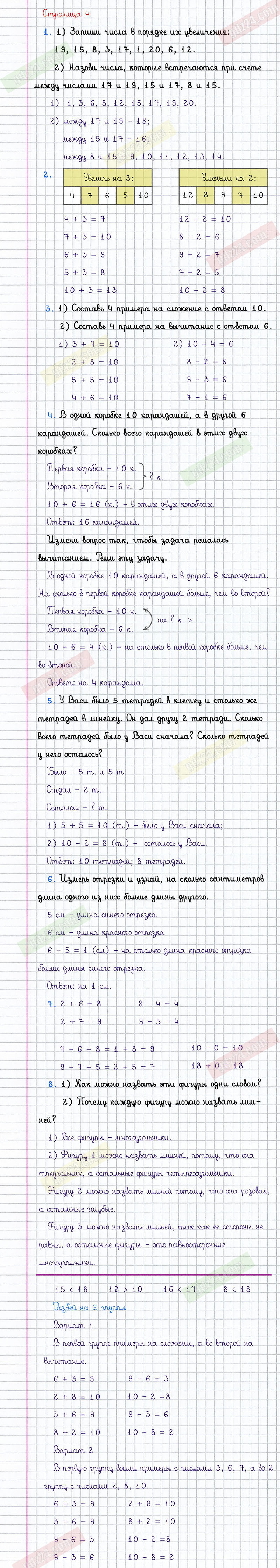 Подробные ответы к заданиям, расположенным на 4 странице 1 части учебника по математике авторов М.И. Моро, М.А. Бантова, Г.И. Бельтюкова для учащихся 2 класса.