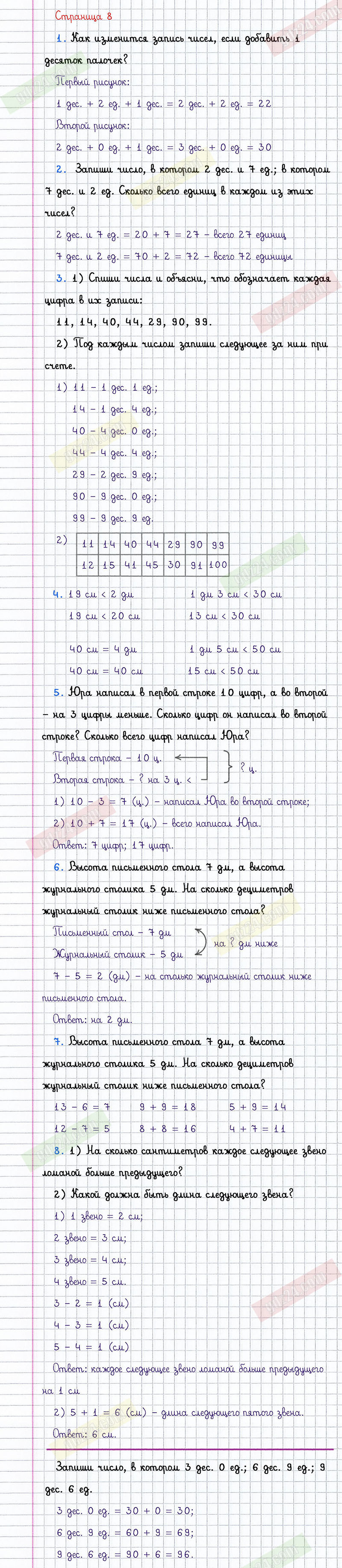 Подробные ответы к заданиям, расположенным на 8 странице 1 части учебника по математике авторов М.И. Моро, М.А. Бантова, Г.И. Бельтюкова для учащихся 2 класса.