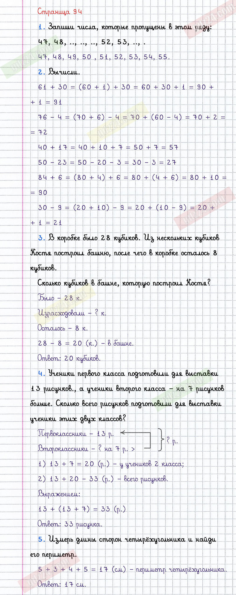 Подробные ответы к заданиям, расположенным на 94 странице 1 части учебника по математике авторов М.И. Моро, М.А. Бантова, Г.И. Бельтюкова для учащихся 2 класса.