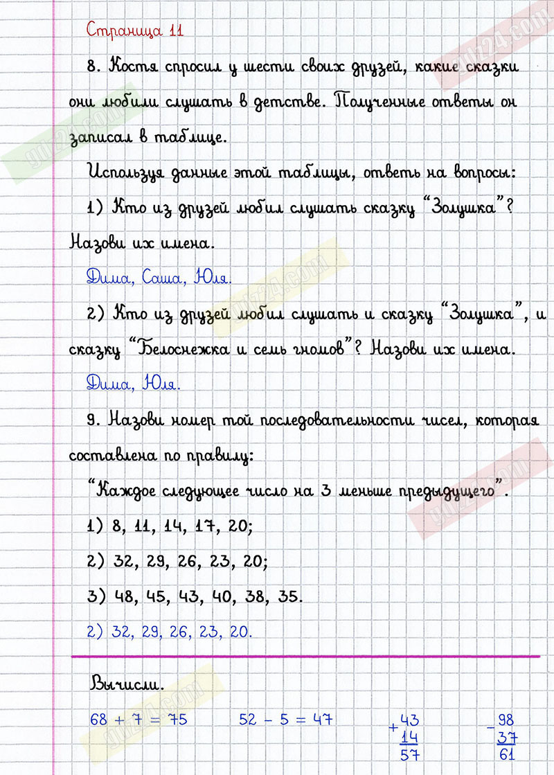 Ответы к заданиям на 11 странице учебника по математике авторов Моро М.И., Бантова М.А., Бельтюкова Г.И. за 2 класс 2 часть.