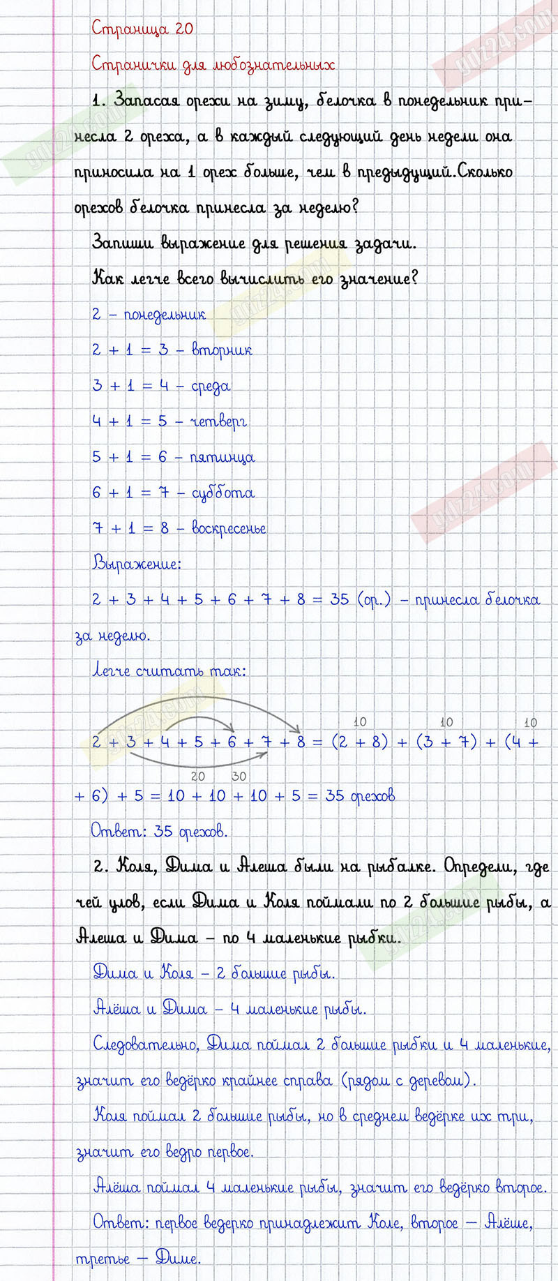Ответы к заданиям на 20 странице учебника по математике авторов Моро М.И., Бантова М.А., Бельтюкова Г.И. за 2 класс 2 часть.