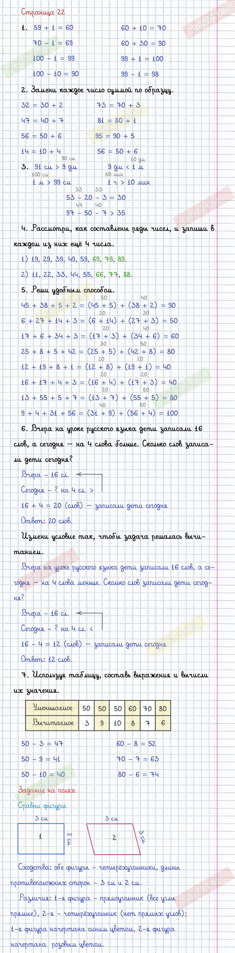 Ответы к заданиям на 22 странице учебника по математике авторов Моро М.И., Бантова М.А., Бельтюкова Г.И. за 2 класс 2 часть.