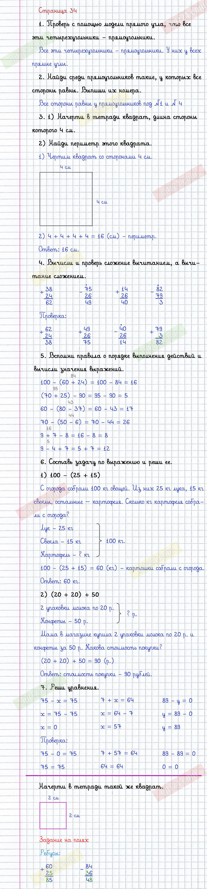 Ответы к заданиям на 34 странице учебника по математике авторов Моро М.И., Бантова М.А., Бельтюкова Г.И. за 2 класс 2 часть.