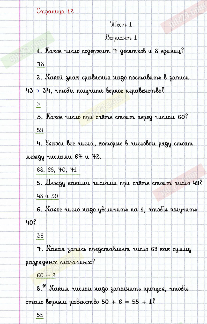 Подробные ответы к заданиям, расположенным на 12 странице проверочных работ по математике автора С.И. Волкова для учащихся 2 класса. Нумерация. Тест 1, вариант 1.