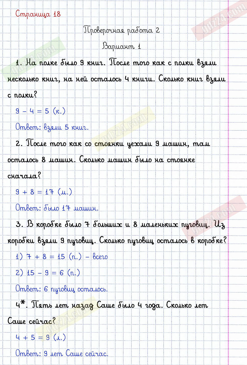Подробные ответы к заданиям, расположенным на 18 странице проверочных работ по математике автора С.И. Волкова для учащихся 2 класса. Сложение и вычитание. Проверочная работа 2, вариант 1.