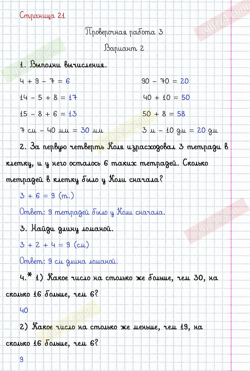 Подробные ответы к заданиям, расположенным на 21 странице проверочных работ по математике автора С.И. Волкова для учащихся 2 класса. Сложение и вычитание. Проверочная работа 3, вариант 2.