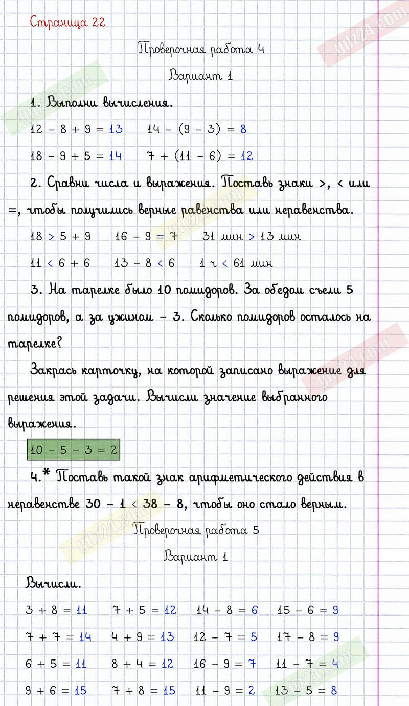 Подробные ответы к заданиям, расположенным на 22 странице проверочных работ по математике автора С.И. Волкова для учащихся 2 класса. Сложение и вычитание. Проверочная работа 4, вариант 1.