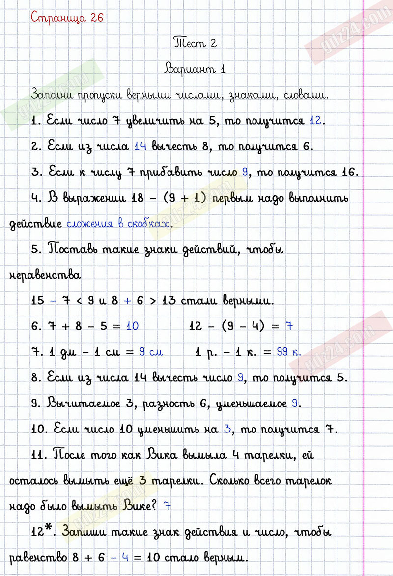 Подробные ответы к заданиям, расположенным на 26 странице проверочных работ по математике автора С.И. Волкова для учащихся 2 класса. Сложение и вычитание. Тест 2, вариант 1.