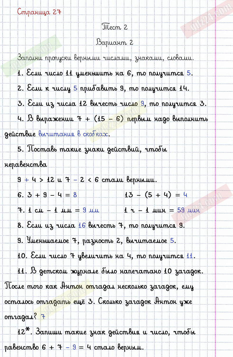 Подробные ответы к заданиям, расположенным на 27 странице проверочных работ по математике автора С.И. Волкова для учащихся 2 класса. Сложение и вычитание. Тест 2, вариант 2.