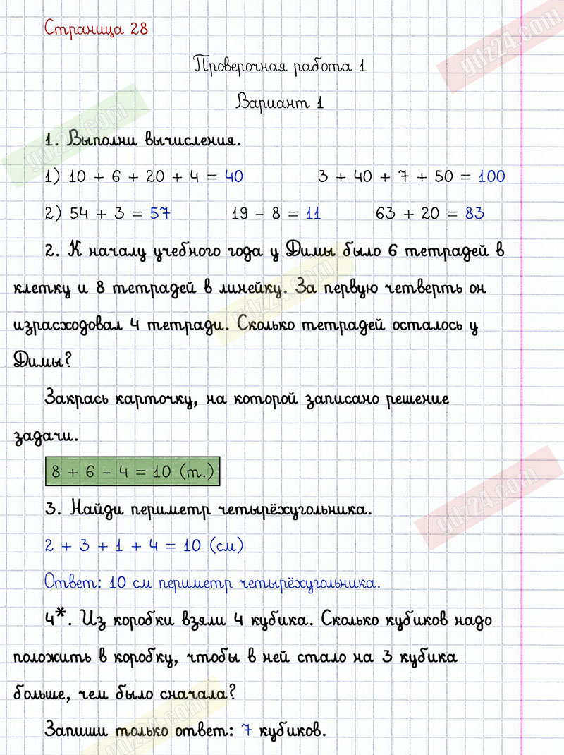 Подробные ответы к заданиям, расположенным на 28 странице проверочных работ по математике автора С.И. Волкова для учащихся 2 класса. Сложение и вычитание. Проверочная работа 1, вариант 1.