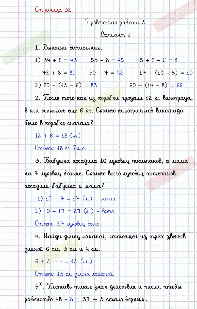 Подробные ответы к заданиям, расположенным на 32 странице проверочных работ по математике автора С.И. Волкова для учащихся 2 класса. Сложение и вычитание. Проверочная работа 3, вариант 1.
