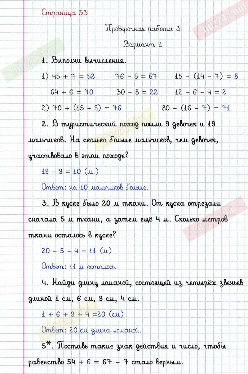 Подробные ответы к заданиям, расположенным на 33 странице проверочных работ по математике автора С.И. Волкова для учащихся 2 класса. Сложение и вычитание. Проверочная работа 3, вариант 2.