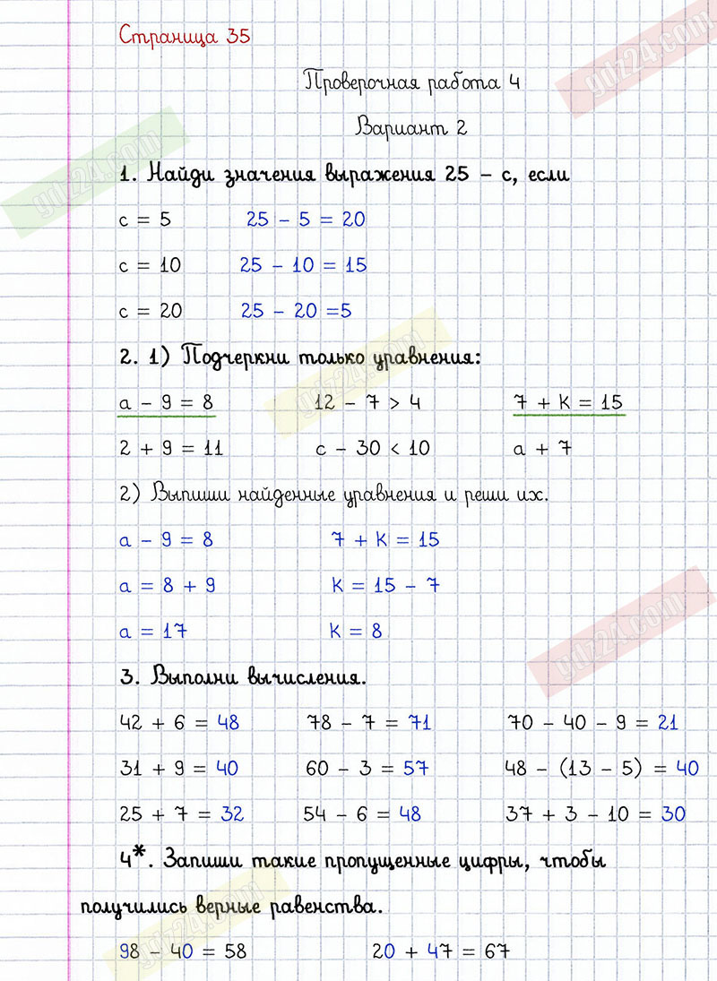 Подробные ответы к заданиям, расположенным на 35 странице проверочных работ по математике автора С.И. Волкова для учащихся 2 класса. Сложение и вычитание. Проверочная работа 4, вариант 2.