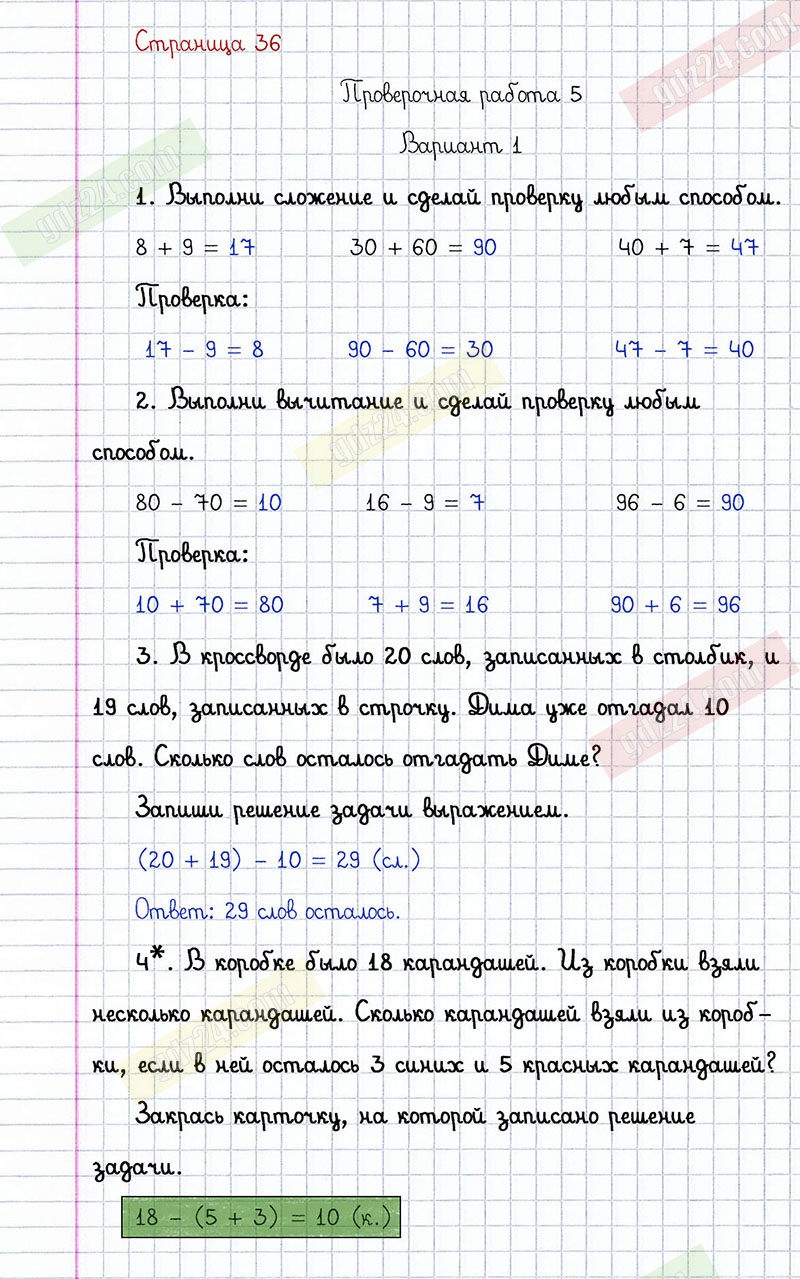 Подробные ответы к заданиям, расположенным на 36 странице проверочных работ по математике автора С.И. Волкова для учащихся 2 класса. Сложение и вычитание. Проверочная работа 5, вариант 1.
