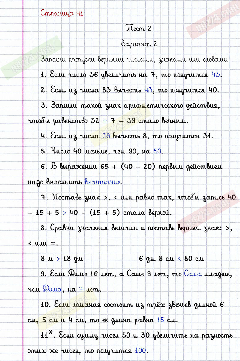 Подробные ответы к заданиям, расположенным на 41 странице проверочных работ по математике автора С.И. Волкова для учащихся 2 класса. Сложение и вычитание. Тест 2, вариант 2.