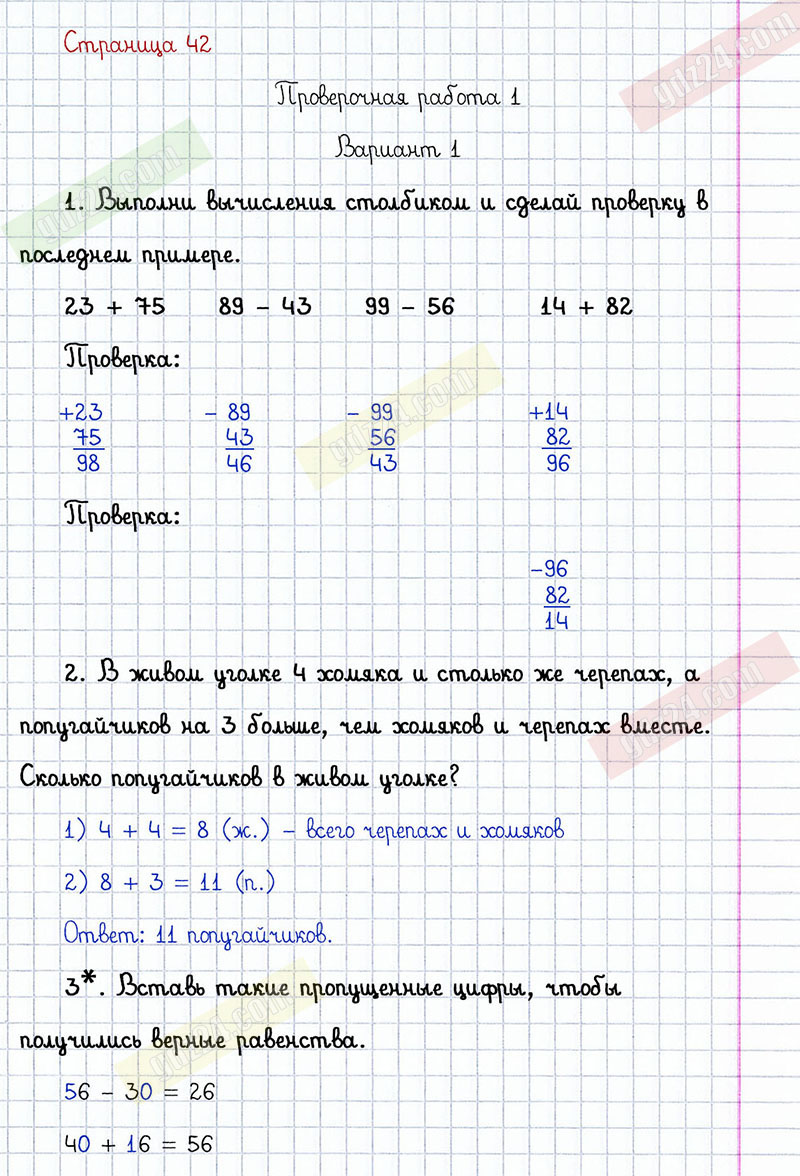 Подробные ответы к заданиям, расположенным на 42 странице проверочных работ по математике автора С.И. Волкова для учащихся 2 класса. Сложение и вычитание. Проверочная работа 1, вариант 1.