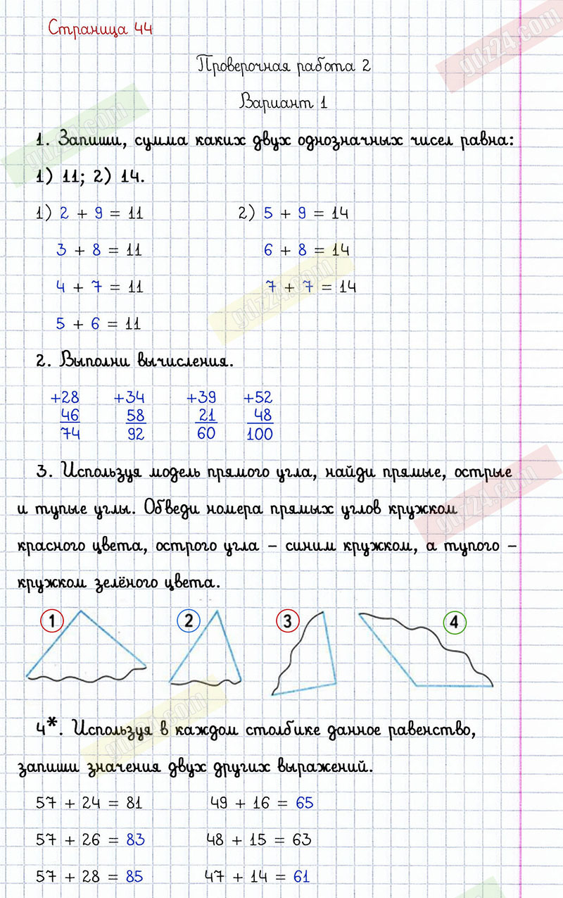 Подробные ответы к заданиям, расположенным на 44 странице проверочных работ по математике автора С.И. Волкова для учащихся 2 класса. Сложение и вычитание. Проверочная работа 2, вариант 1.