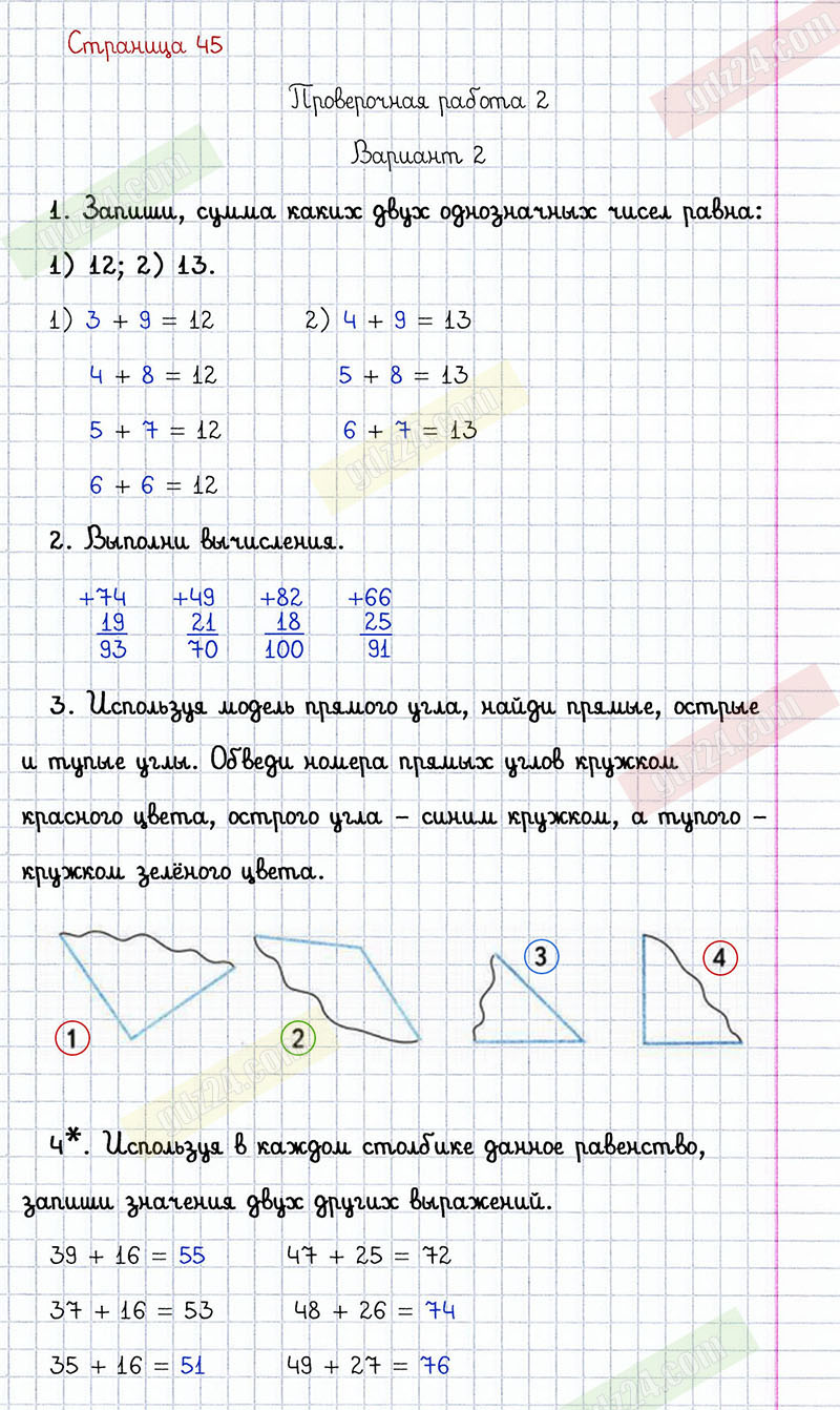 Подробные ответы к заданиям, расположенным на 45 странице проверочных работ по математике автора С.И. Волкова для учащихся 2 класса. Сложение и вычитание. Проверочная работа 2, вариант 2.