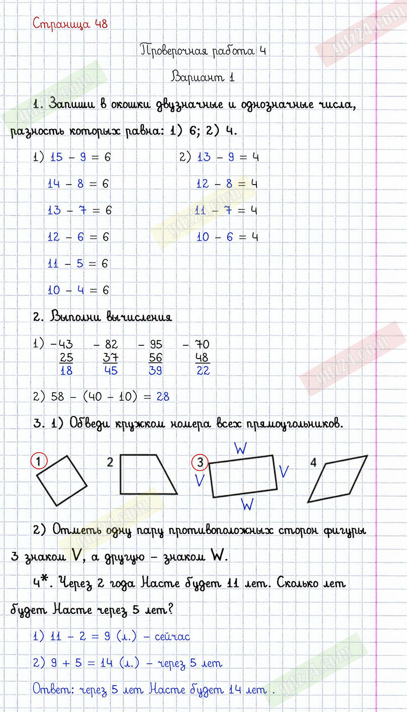 Подробные ответы к заданиям, расположенным на 48 странице проверочных работ по математике автора С.И. Волкова для учащихся 2 класса. Сложение и вычитание. Проверочная работа 4, вариант 1.