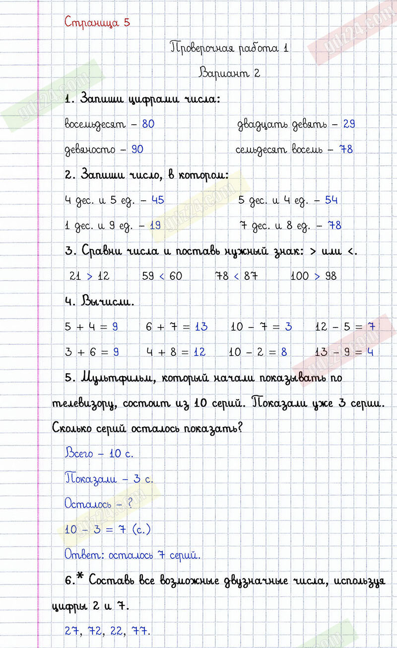 Подробные ответы к заданиям, расположенным на 5 странице проверочных работ по математике автора С.И. Волкова для учащихся 2 класса. Нумерация. Проверочная работа 1, вариант 2.
