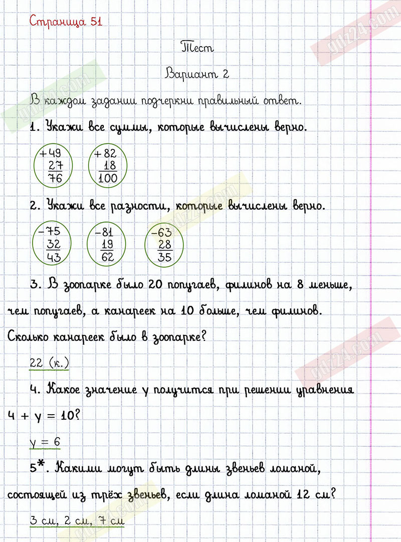 Подробные ответы к заданиям, расположенным на 51 странице проверочных работ по математике автора С.И. Волкова для учащихся 2 класса. Сложение и вычитание. Тест 1, вариант 2.