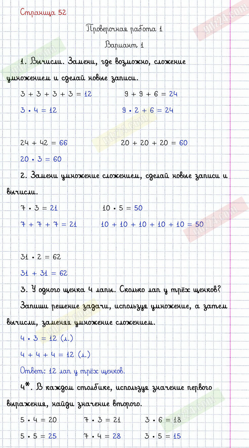 Подробные ответы к заданиям, расположенным на 52 странице проверочных работ по математике автора С.И. Волкова для учащихся 2 класса. Умножение и деление. Проверочная работа 1, вариант 1.