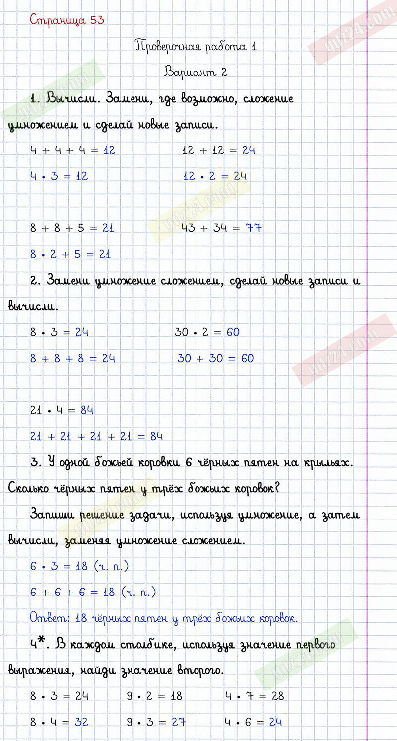 Подробные ответы к заданиям, расположенным на 53 странице проверочных работ по математике автора С.И. Волкова для учащихся 2 класса. Умножение и деление. Проверочная работа 1, вариант 2.