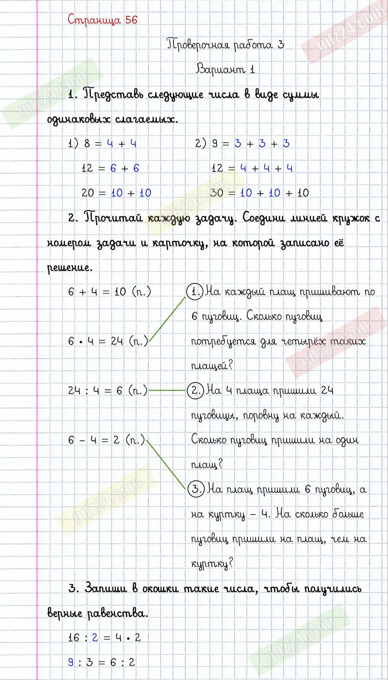 Подробные ответы к заданиям, расположенным на 56 странице проверочных работ по математике автора С.И. Волкова для учащихся 2 класса. Умножение и деление. Проверочная работа 3, вариант 1.