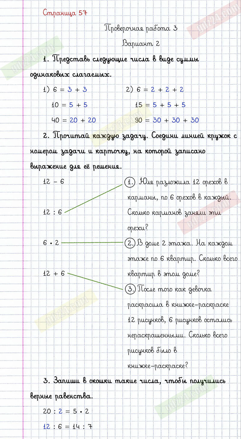 Подробные ответы к заданиям, расположенным на 57 странице проверочных работ по математике автора С.И. Волкова для учащихся 2 класса. Умножение и деление. Проверочная работа 3, вариант 2.