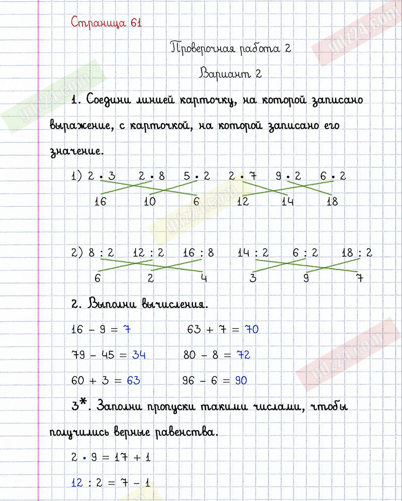 Подробные ответы к заданиям, расположенным на 61 странице проверочных работ по математике автора С.И. Волкова для учащихся 2 класса. Умножение и деление. Проверочная работа 2, вариант 2.