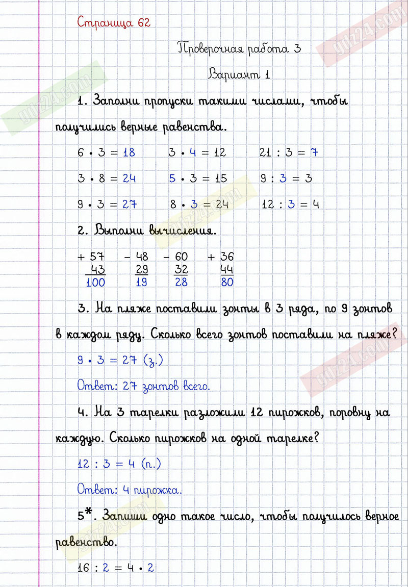 Подробные ответы к заданиям, расположенным на 62 странице проверочных работ по математике автора С.И. Волкова для учащихся 2 класса. Умножение и деление. Проверочная работа 3, вариант 1.