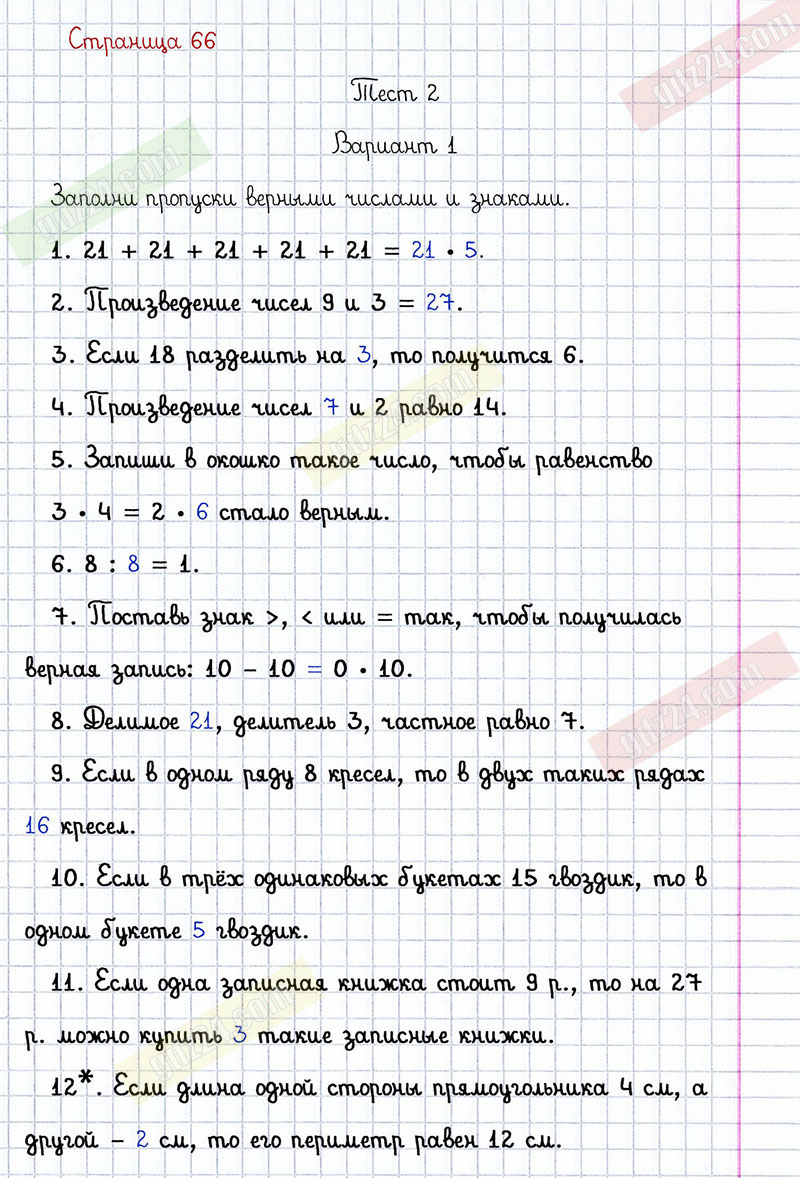 Подробные ответы к заданиям, расположенным на 66 странице проверочных работ по математике автора С.И. Волкова для учащихся 2 класса. Умножение и деление. Тест 2, вариант 1.