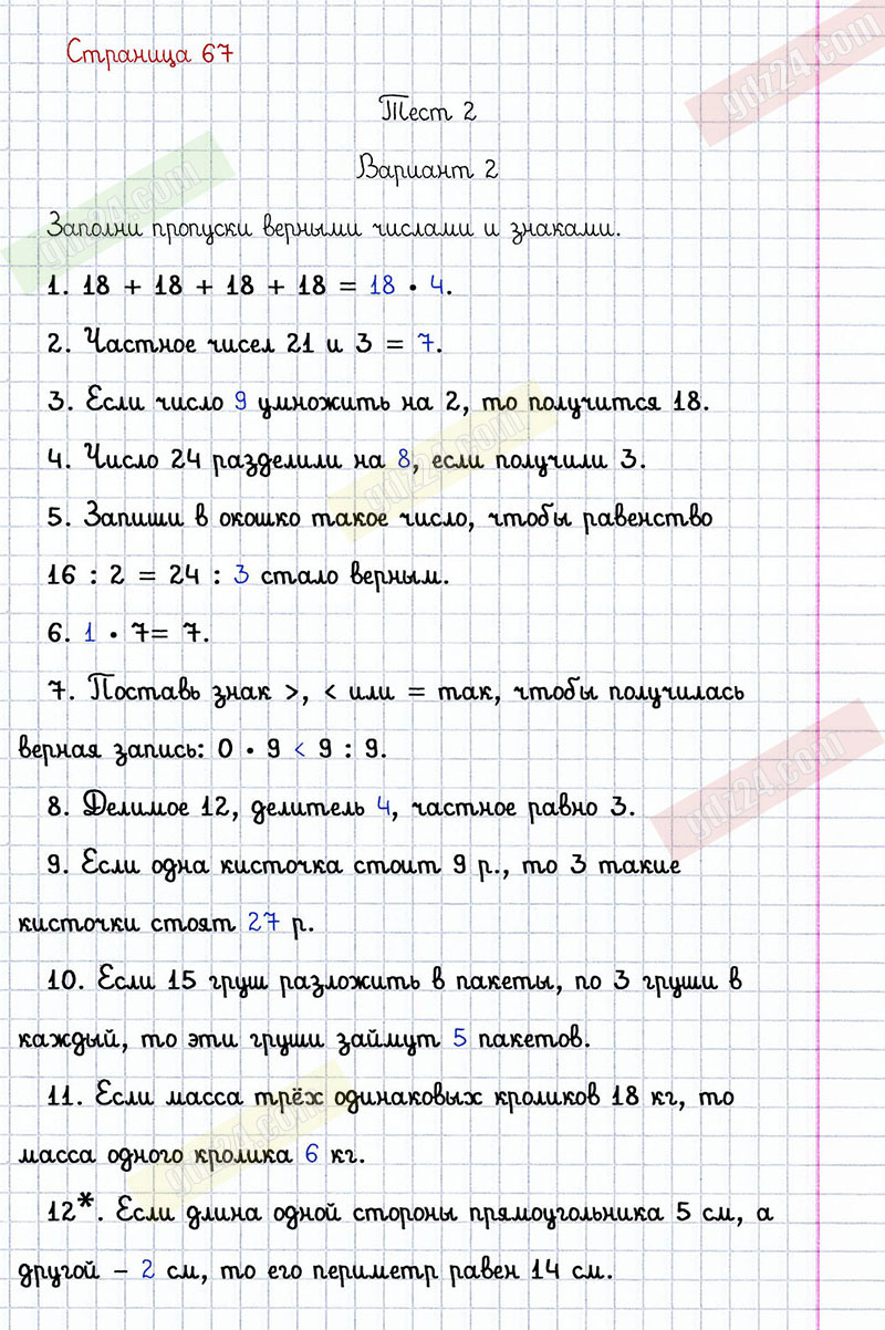 Подробные ответы к заданиям, расположенным на 67 странице проверочных работ по математике автора С.И. Волкова для учащихся 2 класса. Умножение и деление. Тест 2, вариант 2.