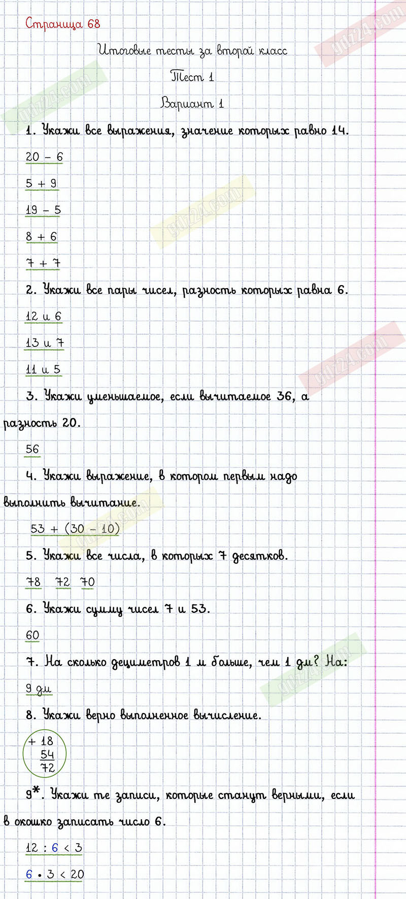 Подробные ответы к заданиям, расположенным на 68 странице проверочных работ по математике автора С.И. Волкова для учащихся 2 класса. Итоговый тест за второй класс. Тест 1, вариант 1.