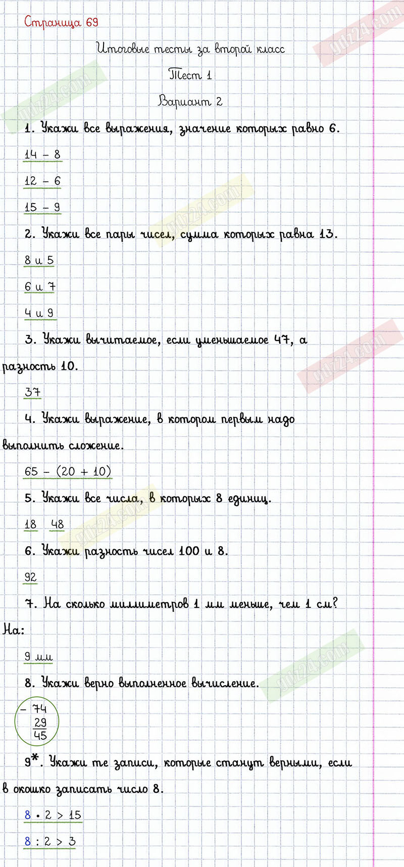 Подробные ответы к заданиям, расположенным на 69 странице проверочных работ по математике автора С.И. Волкова для учащихся 2 класса. Итоговый тест за второй класс. Тест 1, вариант 2.